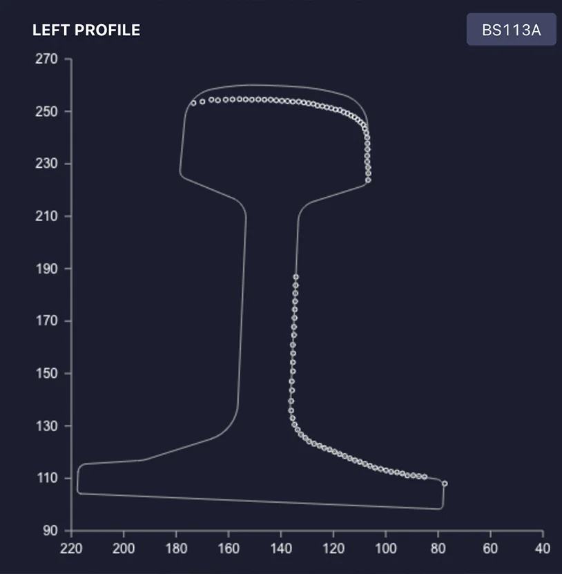 A further capability delivered by AIVR UGMS is the capture of Rail Profile data. This is provided by the same AIVR UGMS unit with no additional sensors, hardware or gauging requirements and delivers a ‘half’ rail profile data stream in parallel with the Geometry data stream.